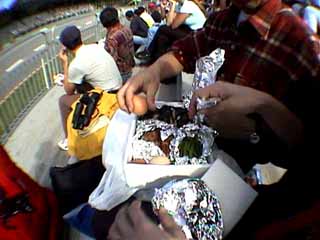 コモ氏の家から歩いて来た我々にはこの自動車競争は運動会のようなもの、そこで弁当はおにぎりに決めた。それに鳥の唐揚げとゆで卵。そして麦茶で決まりである。朝からコモ夫婦のにぎってくれたオニギリが美味しい。周りの目を気にしつつ我々は日本人を主張するのだ。